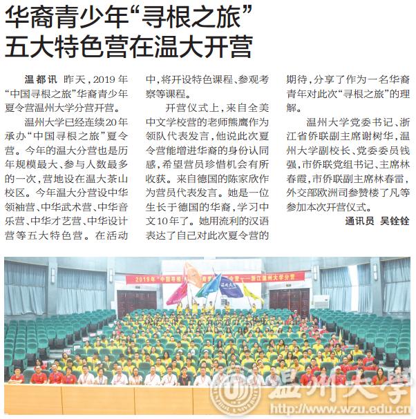 少妇白洁 已经连续20年承办“中国寻根之旅”夏令营。今年的温大分营也是历年规模最大,参与人数最多的一次,营地设在温大茶山校区。今年温大分营设中华领袖营、中华武术营、中华音乐营、中华才艺营、中华设计营等五大特色营。在活动中,将开设特色课程,参观考察等课程。