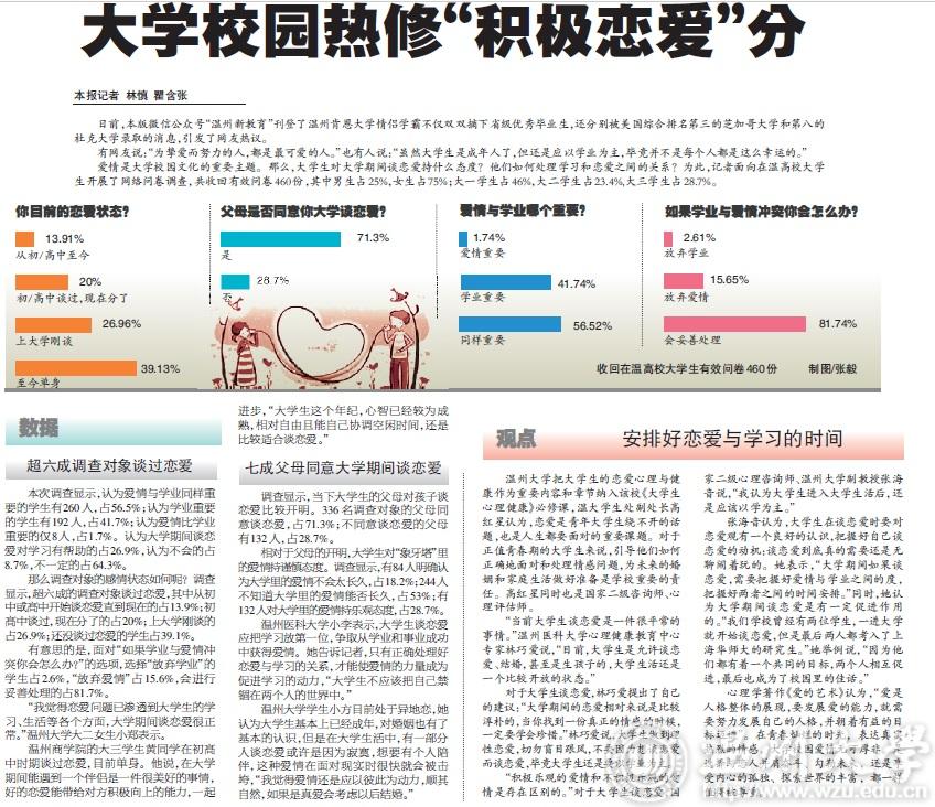 “当前大学生谈恋爱是一件很平常的事情。”温州医科大学心理健康教育中心专家林巧爱说,“目前,大学生是允许谈恋爱、结婚,甚至是生孩子的,大学生活还是一个比较开放的状态。”