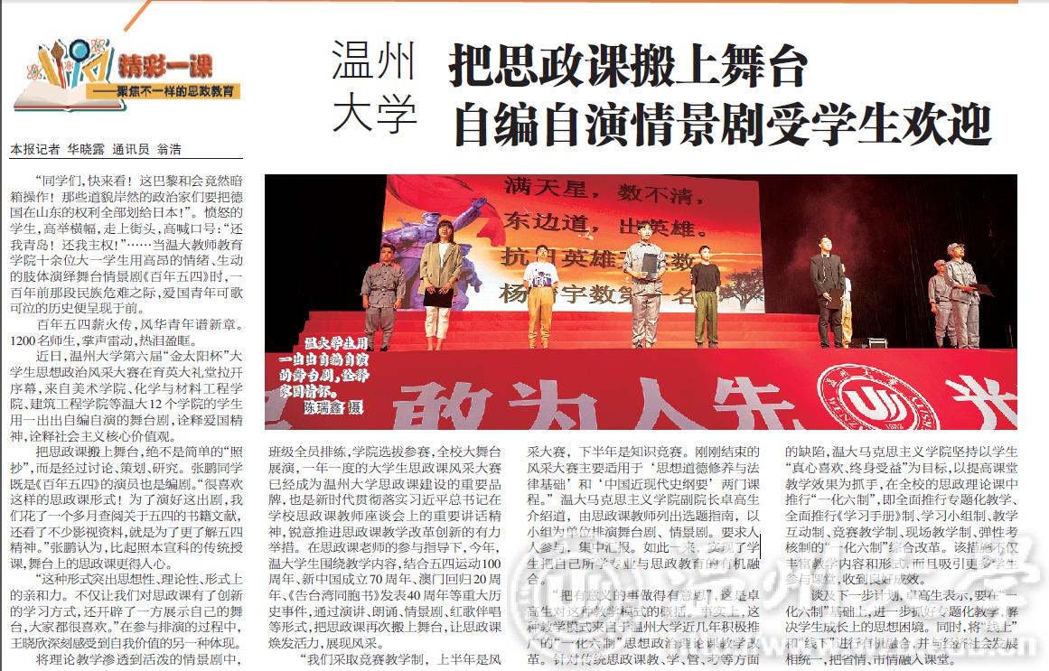 “我们采取竞赛教学制,上半年是风采大赛,下半年是知识竞赛。刚刚结束的风采大赛主要适用于‘思想道德修养与法律基础’和‘中国近现代史纲要’两门课程。”温大马克思主义学院副院长卓高生介绍道,由思政课教师列出选题指南,以小组为单位排演舞台剧、情景剧。要求人人参与,集中汇报。如此一来,实现了学生把自己所学专业与思政教育的有机融合。