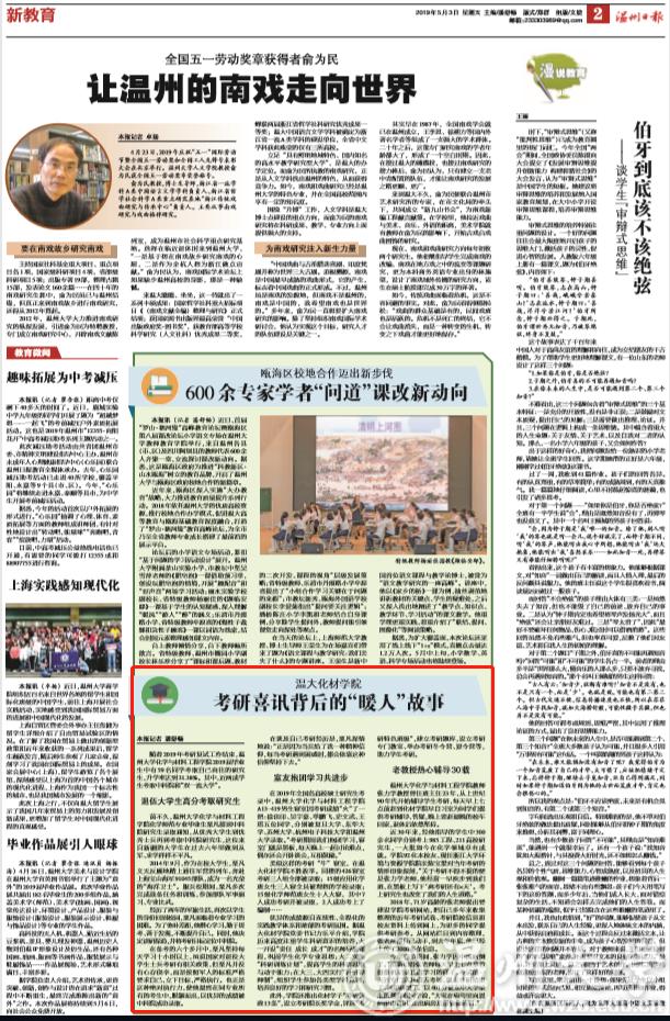优异的成绩源自连续性、全程化的实践教学体系和浓郁的考研氛围。据温大化材学院党委书记方乐平介绍,学院历来高度注重学生科研意识的培养,大一开设“责任 成长 成才”的名师导航课程,巩固学生化学专业思想;大二实施“科研训练计划”,并作为一门必修课程,旨在提高学生的科研思维与动手能力;在大三、大四实行“科研导师制”,积极组织学生参加各类型学科竞赛,培养良好的学习和研究习惯。