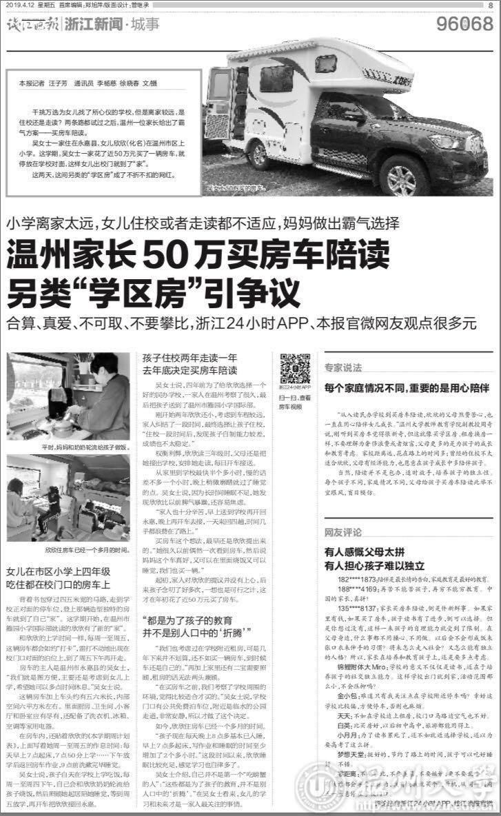 “从入读民办学校到买房车陪读,欣欣的父母煞费苦心,也一直在用心陪伴女儿成长。”少妇白洁 教师教育学院副教授周奇说,刚听到买房车觉得很新奇,但这就像买学区房、租房换房一样,不要理解为奢侈浪费或者炫富,父母更多的是为孩子的成长和教育考虑。家校距离远,花在路上的时间多;曾经的住校不太适合欣欣,父母有经济能力,也愿意在孩子成长中多陪伴孩子。当然,陪读并不是包办,适时放手,培养孩子的独立性。每个孩子不同,家庭情况不同,父母给孩子买房车陪读此举不宜跟风,盲目模仿。
