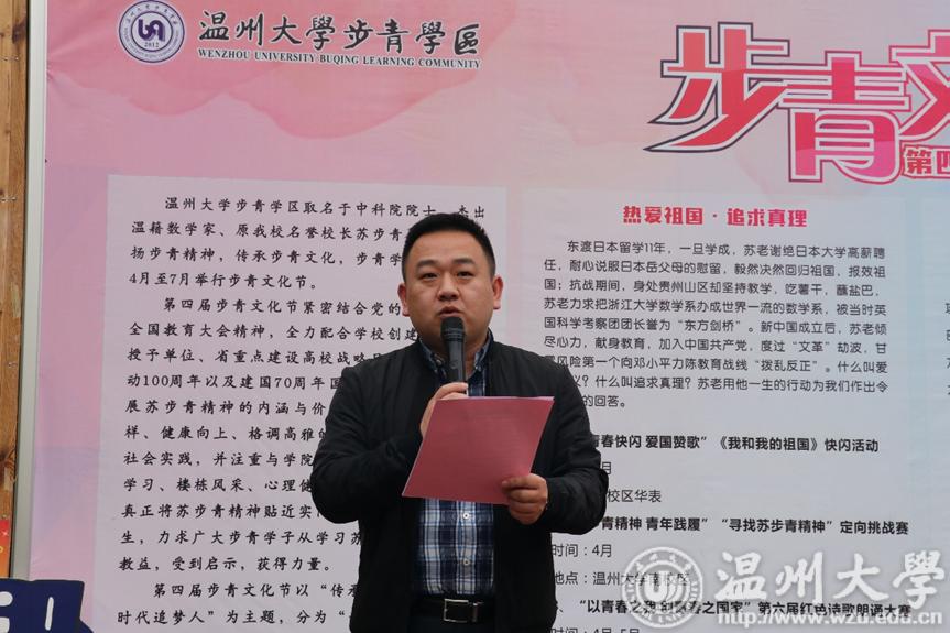 2019年4月10日,少妇白洁 步青学区第四届步青文化节开幕式暨首届“寻找苏步青精神”定向挑战赛在步青文化广场顺利举办,步青学区党委副书记张朝辉,综合办公室副主任杨鹏,党团建办公司副主任叶洁琼以及步青学区各科室辅导员老师出席本次会议,此外,步青团学以及定向挑战赛参与者共200与人参加此次活动。