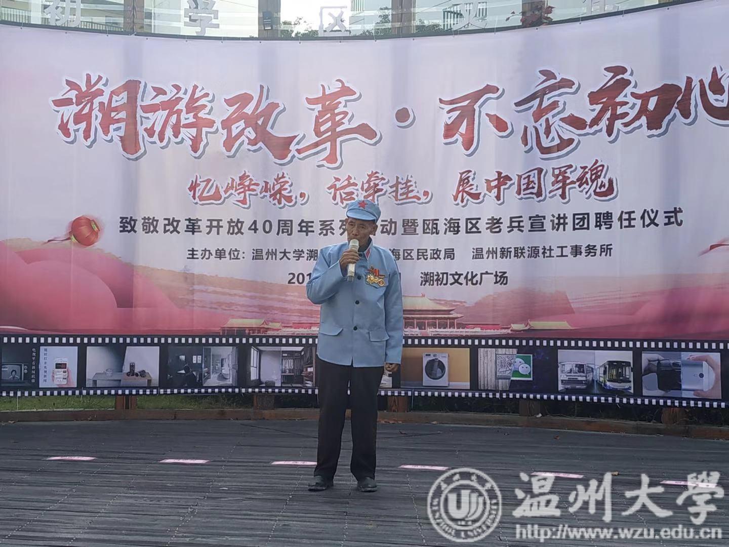 聘任仪式结束后,其中的3位老兵代表为在场的师生带来第一场红色公开课。他们中有参加过援越抗美战争的老兵,也有为保家卫国在战争中左眼失明的老兵,也有8年修路达400多公里的铁道兵。苏云娒老人动情分享:“广大人民群众都过上和平、安定、富裕的生活,不再被外敌欺辱,不再担心受怕,我和在座的老兵们都感到很欣慰,很高兴,觉得当初入伍,保卫国家的决定是正确的,有意义的”。他说,“希望大学生能够认真学习专业知识,为国家建设,祖国的发展贡献自己一份绵薄之力”。徐新滔老人则军装上阵,连续献唱了《伟大的祖国》等红色歌曲,感人至深。