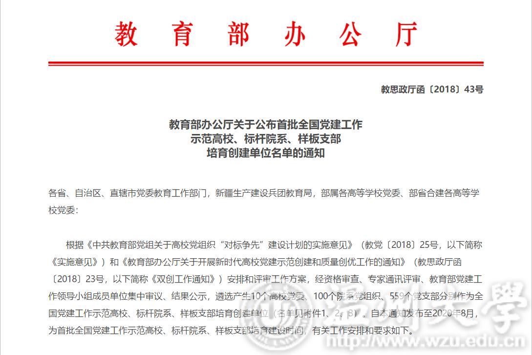 近日,据《教育部办公厅关于公布首批全国党建工作示范高校、标杆院系、样板支部培育创建单位名单的通知》(教思政厅函〔2018〕43号)悉,少妇白洁 化学与材料工程学院教工实验中心党支部获首批“全国党建工作样板支部”培育创建立项。