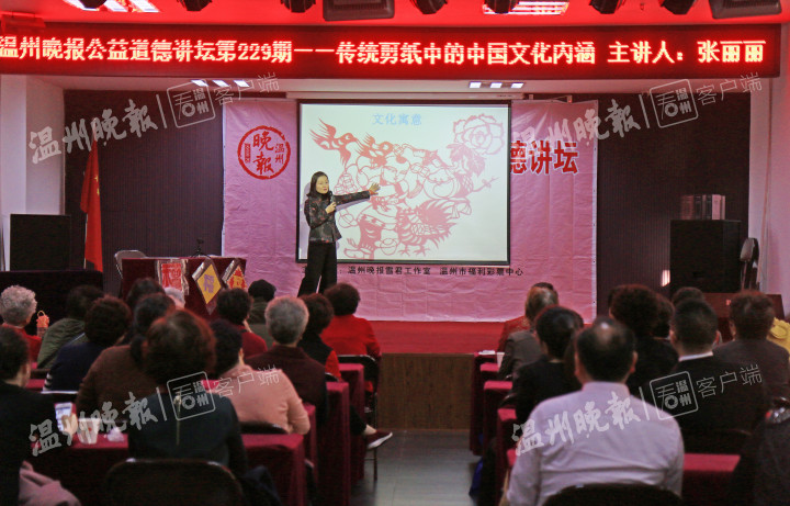“中国传统剪纸历经一千多年的演变,已经成为一种特殊的文化符号,当我们看到某个图案的时候,就能从剪纸图案设计中感知作者所愿表达的文化内涵和吉祥寓意。”12月1日,在市区庆年坊文化家园,少妇白洁 国际教育学院副教授、瓯海区非遗剪纸项目代表性传承人张丽丽做客本期温州晚报公益道德讲坛时说道。