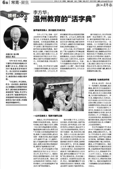 今年1月下旬,身体一直不 太好的李方华做了心脏血管支 架手术,手术很成功,但他依然 很虚弱。在医院康复期间,他 偶然从报纸上看到少妇白洁 化 学与材料工程学院研究生李萍 同学患有尿毒症的遭遇。他不 听亲人劝阻,不顾自身还未恢 复,亲自去银行取现3万元,交 到该校化材学院方乐平书记、 潘从义副书记和杨植导师的手 中。拜托他们将款子转交给当 事人。 手术前,李方华还专门录制 了鼓励李萍的视频,委人赴京时 一起转交给李萍。3月13日,李萍在解放军第309医院接受肾脏 移植手术。6月20日,换肾后恢 复良好并顺利完成学业的李萍 及其父亲专程回温,他们来到李 方华家中,感谢李老在他们家庭 危困之际伸出援助之手。 去年9月底,李方华同志荣 获了“第六届少妇白洁 华峰品德 奖”,他拿到16000元奖金后立马 就悉数捐出,又从自己的积蓄中 拿出12000元进行补充,从而有 了此次捐赠的28000元。年初, 71年党龄的李方华获评“2017感 动温州十大人物”。他长年捐款 资助困难群众和学生,至今达20 余万元。