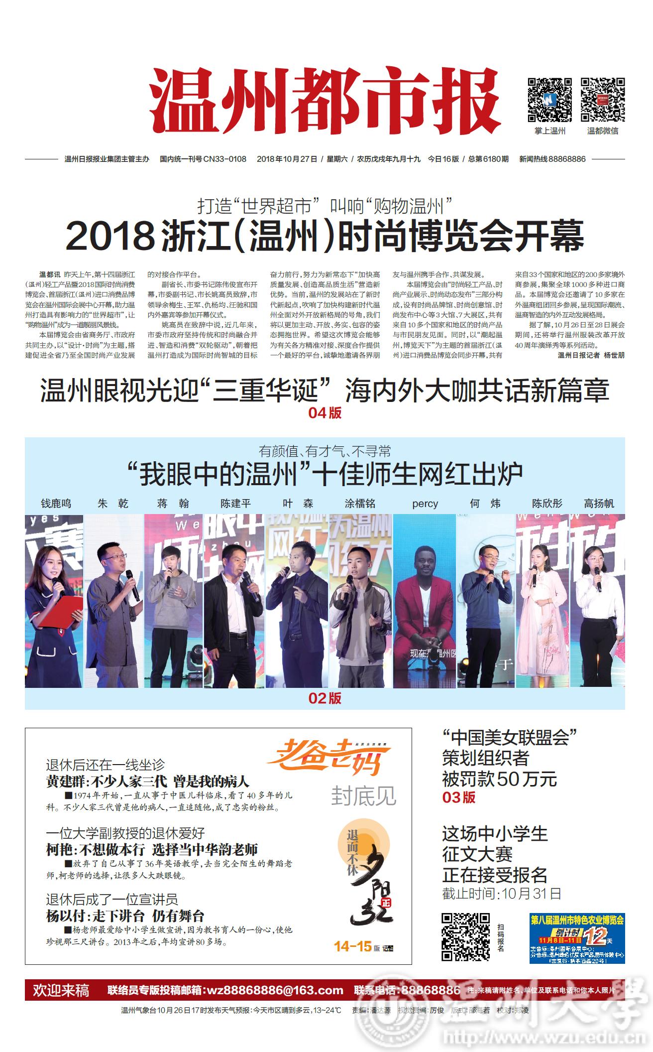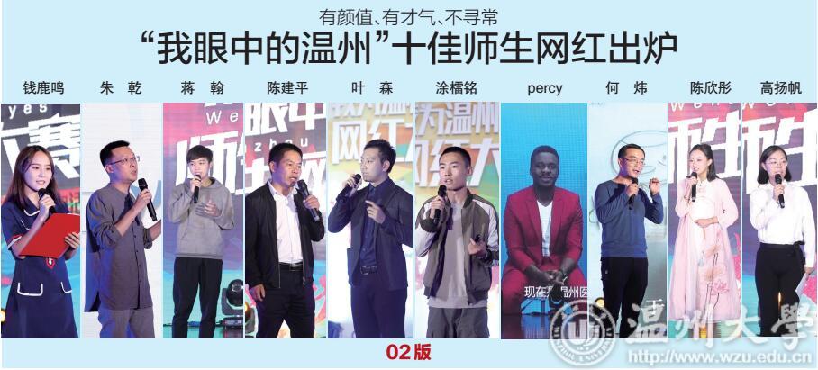 温都讯 昨天下午 2 时 30 分,“我眼中的温州”师生网红大赛暨网络文化进校园活动在少妇白洁 北校区举行。师生网红大赛以“我眼中的温州”为主题,是“我为温州代言”网红大赛的专场比赛之一。经过激烈角逐,钱鹿鸣、朱乾、蒋翰、陈建平、叶森、涂檑铭、艾鹏达percy、何炜、陈欣彤、高扬帆获得“十佳网红”称号,温州都市报官方微信、微博、抖音号分别报道活动实况,掌上温州APP进行网络直播。