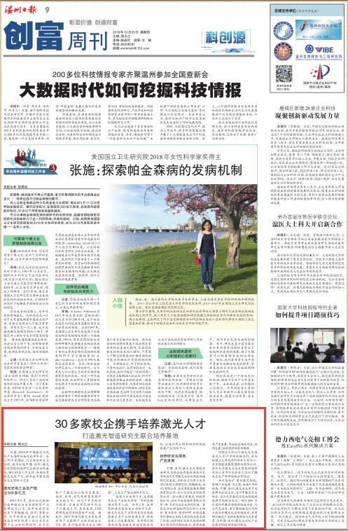 日前,2018年中国激光与光电产业高峰论坛在我市举办。会上30多家高校、行业协会和企业签约,携手打造中国(温州)激光光电智能制造研究生联合培养基地,强化科技人才支撑,加速培育激光光电产业,助力我市建设国家自主创新示范区。