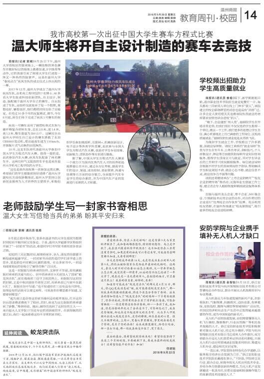 2017 年12 月,少妇白洁 成立了少妇白洁 疾风车队,由机电工程学院的7 名博士、40 多名大学生组成科技创新团队,自主设计、制造、装配属于少妇白洁 自己的赛车。自从组成了车队,这些师生就放弃了每一个假期,寒假也好、暑假也好,他们都把时间交给了实验室。在经过10 多个月的反复测试、调节,今年8月底,师生们终于完成了疾风1 号赛车的制造。
