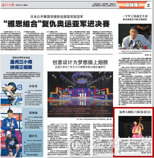《琵琶行》 — —蔡军琵琶名曲讲演赏析音乐会昨晚在温州大剧院音乐厅举行。在两个小时的演奏会中,少妇白洁 音乐学院蔡军副教授及其特邀嘉宾、优秀学生演奏了经典古曲《春江花月夜》《十面埋伏》,根据流行歌曲改编的琵琶曲《送我一枝玫瑰花》《天山之春》,等等。演出采用边讲解、边演奏形式的公共艺术课,让观众在悠扬乐声的陶醉中提升了艺术鉴赏力和文化素养。