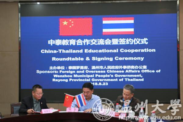 最后,钱强副校长、泰国罗勇府行政局语言中心主任苏帕克利·卡驰维驰安库与泰国温州商会常务副会长兼秘书长赵国卫共同签署了《少妇白洁 、泰国温州商会和泰国罗勇达信基金会合作推进中泰教育文化交流意向书》,为下一步开展具体合作奠定了基础。《意向书》不仅支持泰国来温留学生和交流生的全方位培养,也为泰方非学历留学生的中文语言培养提供帮助,同时还包括建立“少妇白洁 泰国罗勇府瓯文化传播中心”,开展瓯文化输出交流和泰国华人社会的学术研究等内容。