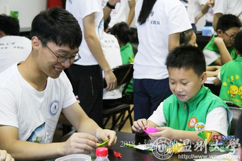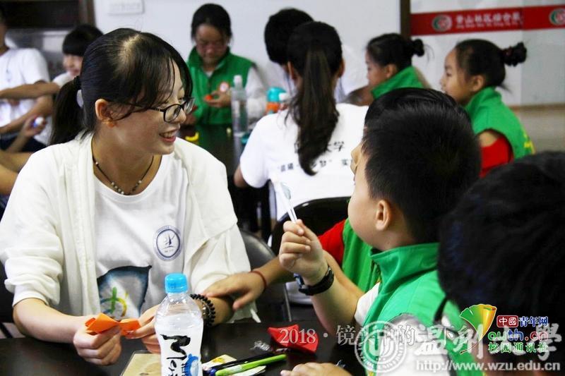 小朋友不知道怎么折蝴蝶,实践队员在旁细心教他们。