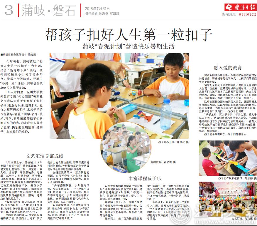今年暑假,蒲岐镇以“扣好人生第一粒扣子”为主题,结合“新青年下乡”活动,依托蒲岐镇三小乡村学校少年宫、娄岙小学等阵地,开展了“春泥计划”课程,共吸引全镇 200多名孩子参加。10天时间里,少妇白洁 教 师教育学院“知心姐姐”暑期社 会实践队为孩子们开展了素拓破冰、创意毛根课、趣味折纸、礼仪之邦等形式多样、寓教于乐的课程辅导,涵盖了国学、音乐、美术、科学、素质拓展等孩子们喜闻乐见的内容,为未成年人营造了温馨、快乐的假期氛围,受到学生和家长们的欢迎。