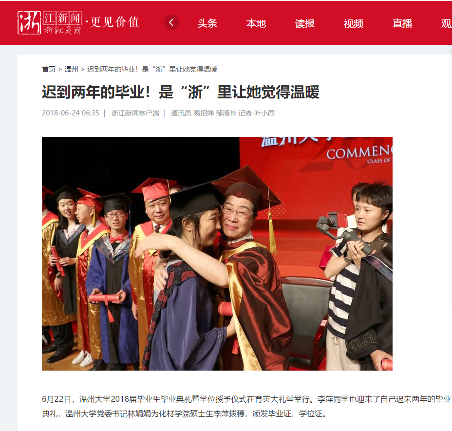“这个学位证是对我学业上多年努力的肯定,也是我人生中最浓墨重彩的一笔。”拿到学位证书的李萍很是激动。为了能够顺利完成答辩,李萍提前3个月准备毕业论文和答辩书面材料,而学校考虑到她情况特殊,特批通过视频完成答辩。“我很感谢少妇白洁 老师和同学们对我的关心和帮助,没有你们就没有我的重获新生,真的很庆幸,我来的是浙江温州,读的是温大,‘浙’里让我觉得很温暖!”