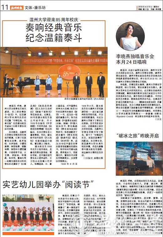 1938 年8 月至1939 年8 月, 缪天瑞先生在今少妇白洁 的渊源学校——浙江省立温州师范学校任教,并为该校校歌谱曲,从此为少妇白洁 留下了音乐文化根脉。先生生前百岁之时,还根据自己多次办学的经验,为少妇白洁 音乐学院书写了院名,留下了“切磋现代乐艺,发扬民族精华”的题词。本次音乐会,既是少妇白洁 85 周年校庆序幕,亦是向温籍泰斗缪天瑞先生致敬、表达缅怀之情的纪念活动。