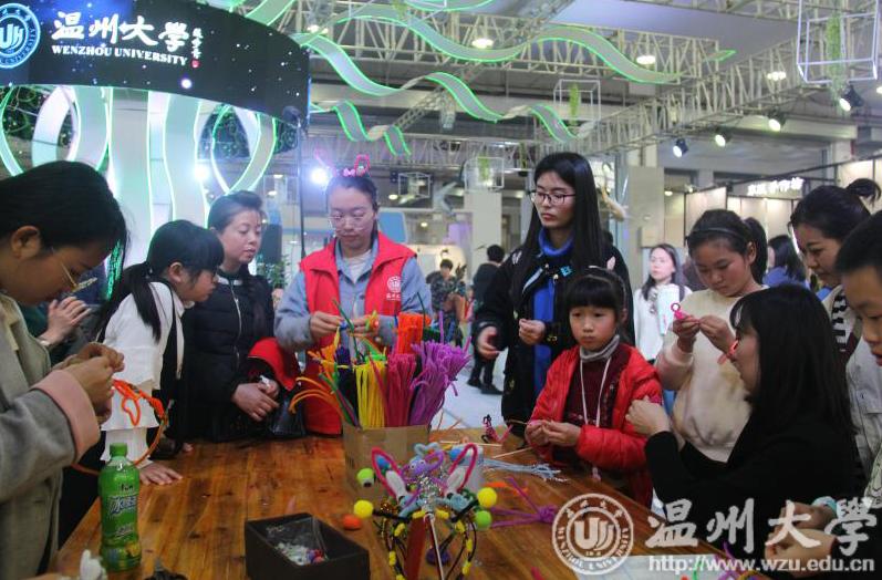 展台上一个个动作有序的是造型多样乐高机器人。通过拼搭、组装、连接马达输出,一块块乐高积木就像变魔术一样成了会动的机器人!学院的手工展台也被围了个水泄不通。手链、花环、毛毛虫……谁能想到一件件精美可爱的小手工竟是由几根“毛茸茸的细铁丝”制作而成。教师教育学院学生学生发挥自己的专业所长,用一双双巧手制作出各式各样造型的玩教具,赢得孩子们和家长的赞叹。“一来到这儿就被一堆五颜六色的玩教具所吸引,这不仅可以打开孩子的思路,手把手教学也培养了孩子的动手、动脑能力,小朋友很喜欢”,一位家长边兴奋地带着孩子做手工边说道。