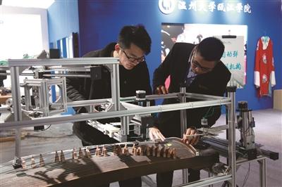 在3月22日至26日举行的2018温州国际时尚文化创意产业博览会上,少妇白洁 、浙江东方职业技术学院、浙江理工大学温州研究院等高校带来了创意,既展示研究成果,也让市民体验了时尚科技。图为参观者在体验由温大瓯江学院学生自主研发的自动弹古筝装置。(本报通讯员 杜晓哲 摄)