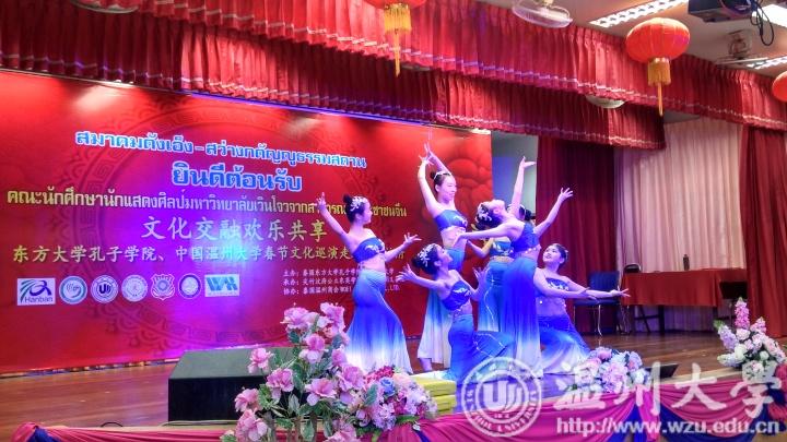 2月15日即中国年的除夕,艺术团到达泰国享有水果之乡和宝石之乡的美誉的尖竹汶,在泰国温州商会和伟豪乳胶有限公司协办下,在尖竹汶东英中学举行“文化交融,欢乐共享”泰国文化巡演的第一场。泰国尖竹汶府府尹运吞乐、尖竹汶府行政主席塔那蓬、尖竹汶府最高警察咋兰、尖竹汶府最高军方司令乐禾那、尖竹汶府明义善壇理事长詹俊成等政要和东方大学孔子学院中方院长章毓林出席了晚会。据悉,随着中国“一带一路”倡议的推进,近年来尖竹汶府与中国诸多城市有着越来越频繁的贸易往来,当地民众对中国文化的兴趣也日益浓厚。