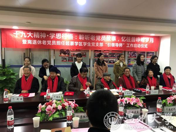 12月14日上午,离退休老党员担任超豪学区学生支部“引领导师”工作启动仪式举行,七名离退休老党员,学校有关部门、学院负责人及超豪学区全体教工党员、60余名学生党员参加仪式。仪式上,学生党员献上诗朗诵《十九大礼赞》,并为被聘为学区“引领导师”的七位离退休老党员送上鲜艳的红色围巾。窗外寒风瑟瑟,屋内温暖如春。老少党员们的心紧紧连在了一起。