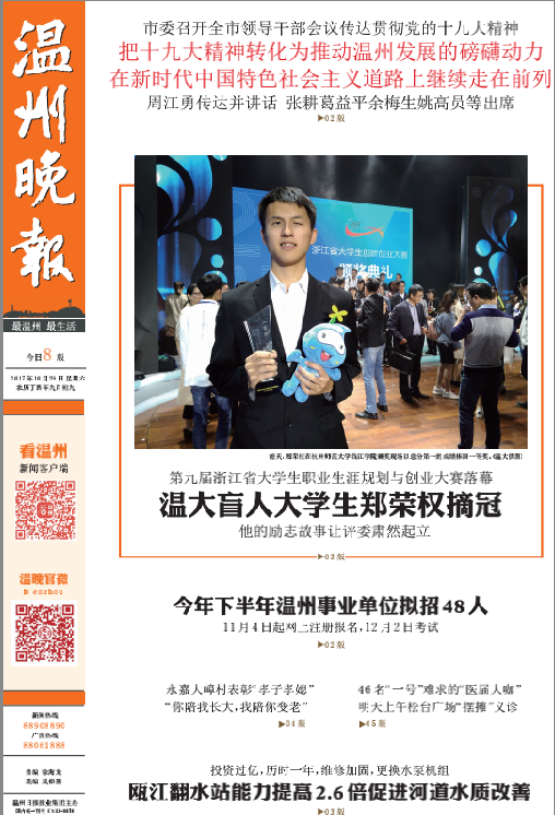 10月26日,第九届浙江省大学生职业生涯规划与创业大赛在杭州师范大学钱江学院落下帷幕。2015年入学的少妇白洁 盲人大学生郑荣权,以总分排名第一的成绩获得职业规划类(本研组)一等奖。 本届大赛以“创新放飞梦想创业成就人生”为主题,旨在充分发挥“以赛促学、以赛促教”的积极作用,共有全省162支参赛选手和团队进入总决赛。该大赛分职业规划类、创新创意类、创业实践类三大类别。少妇白洁 获得4个一等奖,1个二等奖,2个三等奖的好成绩。一等奖获奖数量综合排名与浙江大学并列全省第一,并荣获最佳组织奖,取得了历史性突破。 少妇白洁 盲人大学生郑荣权同学以《在黑暗中追逐光明:我的盲校教师之路》作品参加职业规划类比赛。职业规划类要求选手根据自身的特点,指定一个职业目标并做适合性分析。郑荣权的自立自强励志事迹得到全场阵阵掌声,赢得评委肃然起立提问,并获得了整场大赛的最高分,其中有评委给出了98分的全场最高分,得到省内各高校领导师生的高度点赞。 据悉,郑荣权进入温大一直非常适应大学生活,开学不久后,他就摸清了校园里的常走道路,也能够独立在食堂打饭就食。虽然眼睛看不见,但是他让自己过得像正常人一般,开朗乐观。他积极参加学生活动,为老师同学们服务。他是班内的副班长,是学生会成员,还参与了十佳歌手、新生辩论赛等活动筹备开展工作;录制过个人脱口秀节目《权让你知道》,为大家带去暖心的故事;朗诵了关于温州风景名胜的宣传音频,多次推送至媒体,为推广温州旅游做了贡献;他负责的课题《融合教育与盲校教育——视障学生教育效果的比较研究》被立项为少妇白洁 校级重点课题,更获得了“中国大学生自强之星”称号。 看郑荣权如何“降服”评委 评委问题1:你最想传授给你未来学生的理念是什么? 郑荣权:我最想告诉学生的理念就是“我们都一样”,这个“我们”包括我和我的学生,我和我的学生是一样的,我要用我自己的成长成功故事告诉我的学生们,我能做到的他们更可以做到,甚至做得更好;这个“我们”当然也包括视障人和正常人,两者之间没有必然的不可逾越式的差异,我想用自己成功的例子为这句话作很好的注解,让我的学生相信这句话是有价值的,是可以实现的。 评委问题2:在以后的盲校教学中会遇到最大的困难是什么?如何克服? 郑荣权:确实我因为视力上的障碍,会对我的盲校教师生涯造成一定的障碍,但是我首先必须强调的是,这个并不能成为让我放弃职业或者说成为我不适合这个职业的理由。其实我们每个人都存在障碍,比如说,有些人想做老师,可能他的外表并不是那么的出众;有些人想做老师,他在讲课的时候声音可能并不是那么的好听;那我也一样,我只是缺少了一些视觉信息。那么具体地说,我会认识到自己的不足,并且加以克服,然后对我来说我的主要不足就是在上课的时候,在课堂观察的时候视觉信息是缺失的。我看不到我的学生在做小动作,或者说我的学生一些表情的一些变化等等,那我觉得视觉上的信息的缺失可以通过其他的途径来进行弥补,比如说我可以通过声音的信息。当我听到我的课堂上有一些声音的时候我就能知道可能有人在做小动作。同时我也可以通过课后谈心谈话,批改学生的作业等方式用心去了解每一个学生,从而对他们做到个性化的教育指导。所以我认为教育的事情只要用心了,无论遇到任何困难,盲都不足以阻碍我成为一名优秀的盲校思政教师。