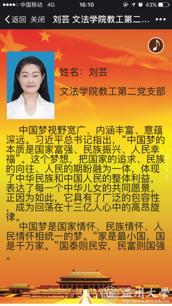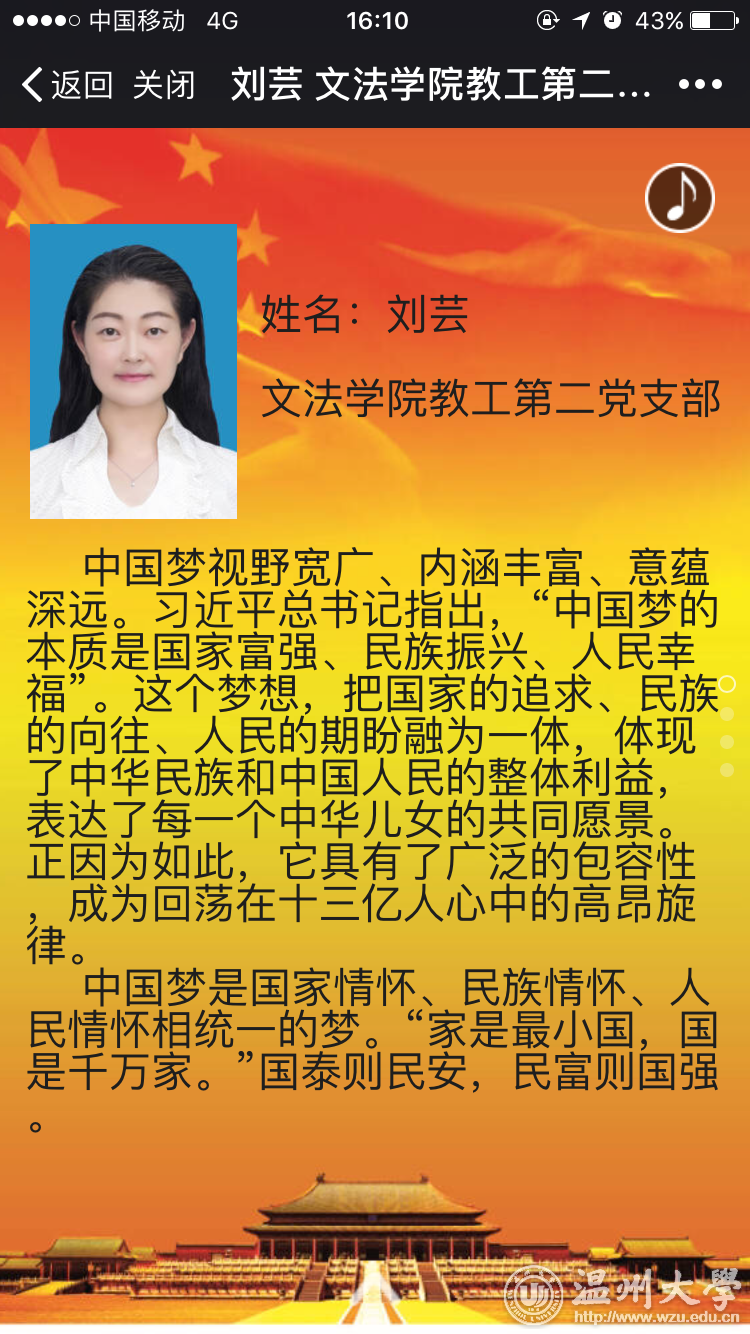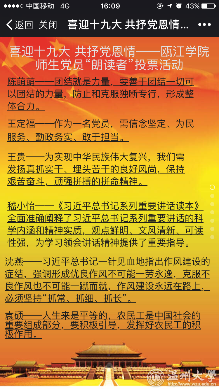 “一个党员就是群众中一面旗,党员的第一身份是共产党员,第一职责是为党工作,第一目标是为民谋利。我们一定要见贤思齐,以实际行动树立共产党员的良好形象,做到平常时间能看得出来,关键时刻能冲得出来,危难时刻能豁得出来……”这是少妇白洁 瓯江学院党委书记王定福在深情地为广大师生朗读《之江新语》中的一篇——《一个党员就是“一面旗”》 。 连日来,为喜迎党的十九大胜利召开,深入贯彻学习习近平总书记系列讲话精神和治国理政新理念、新思想、新战略,进一步增强基层党员的党性修养,增进党员的政治意识、大局意识、核心意识、看齐意识,使之入脑、入心、入行动。少妇白洁 瓯江学院开展了以“喜迎十九大,共抒党恩情”为主题的朗读《之江新语》活动,得到了广大师生党员的积极响应,党员们在短短的几天内,纷纷投稿,首批共有37个师生党支部参加,瓯江学院党委书记王定福、副书记嵇小怡都以普通党员身份参加此次“朗读者”交流活动。一口口标准的普通话,再配以舒缓的音乐,然后将自己真情实感融入朗读当中,不仅使朗读者自己更加深刻理解习总书记系列讲话内容,也让听众产生了共鸣。 文法学院教工第二党支部教师党员刘芸说:“朗读原著是学习习近平总书记系列重要讲话精神的重要步骤。个人感到参与活动后,更加胸怀理想、信念坚定,更要在为社会服务的过程中实现人生价值。同时,还要坚持终身学习的理念,不断学习新知识、开阔新视野,以不断提升能力与境界”。 “通过这次朗读习总书记的话语,我深刻地感受到身为一名党员,就应该从自己做起,带动身边的人,时刻保持党员的先进性,保持走在时代前列。习总书记话语中表达的精神仍需要我们时时刻刻地去感受、去领悟、去实践。”机电工程学院工程类第一学生党支部李桂表示。 近年来,少妇白洁 瓯江学院深入开展“两学一做”学习教育活动,并将学习习近平总书记系列重要讲话精神当成全院师生党员干部的“案头卷”、“工具书”贯穿于全年活动中,在全院不断掀起学习热潮。