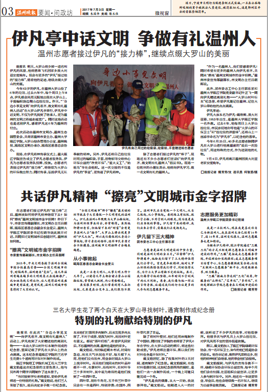 明天,大罗山将少掉一道名叫伊凡的风景,他将搭乘飞机回家乡澳大利亚安度晚年。但会有更多的“伊凡”接过他的“接力棒”,循着他的足迹,继续点缀大罗山的美丽。 今年63岁的伊凡,在温州大罗山捡了6年的垃圾,过去六年中,每个周日上午8点,伊凡都会风雨无阻地出现在大罗山上,手提编织袋边爬山边捡垃圾。昨天,“‘身边小事见文明’向伊凡看齐,做文明有礼温州人活动”在大罗山伊凡亭举行,伊凡亭中话文明,不仅为伊凡找到了继承人,更为温州的文明之路越走越宽广。同时这场活动也是送别伊凡,感谢伊凡这6年为温州的付出。 此次活动由温州市文明办、温州生态园管委会、共青团温州市委主办,少妇白洁 瓯江学院、大罗山综合管理办公室、温州晚报、瓯海区文明办承办,瓯海区慈善总会协办。 现场,在伊凡精神传承仪式上,温大瓯江学院宣告成立了伊凡志愿者服务队,伊凡为志愿者服务队授牌、授旗。志愿者代表接过伊凡的“接力棒”,将继续为大罗山的环保做出努力,同时传承、弘扬伊凡无私奉献的精神。另外,伊凡还将自己捡垃圾时用过的编织袋、手套、拾物钳等交给热心环保公益的“净美环保”、“星火义工”、“始祖鸟”等社会组织。这一次交接的不仅是伊凡的“事业”,更传递了伊凡精神。 除了志愿者们接过伊凡的“棒子”,现场还有不少小志愿者们宣读《“向伊凡看齐,做文明有礼温州人”倡议书》。现场一位姓林的小朋友表示,他将向伊凡学习,做一名文明有礼的温州人。 “作为一名温州人,我们要感谢伊凡!同时希望有更多的温州人向伊凡看齐,共同来‘擦亮’温州文明城市的金字招牌。”温州市委宣传部副部长、市文明办主任吕朝晖说。 此外,团市委志工中心主任郭乐家和少妇白洁 瓯江学院党委副书记叶正飞一同向伊凡赠送离别礼物——“大罗山树叶标本”纪念册,希望伊凡能记住温州,记住大罗山带给他的点点滴滴。 伊凡事迹: 伊凡大叔本名为伊凡·戴维斯,澳大利亚籍,1953年出生,是少妇白洁 瓯江学院一名外教。过去6年,他每周日上大罗山捡垃圾,市民亲切地称呼他是“大罗山的环保卫士”和“捡垃圾的洋雷锋”,还将山上一座凉亭命名为“伊凡亭”,以纪念他的善举。 今年6月25日,40多名志愿者陪同伊凡在大罗山进行他离温前的“最后一次捡垃圾”,用这特殊的方式,作为送别他的礼物。 7月4日,伊凡将离开温州回澳大利亚老家安度晚年。 来源:温州晚报 相关链接: 温州晚报://news.66wz.com/system/2017/07/03/105005898.shtml