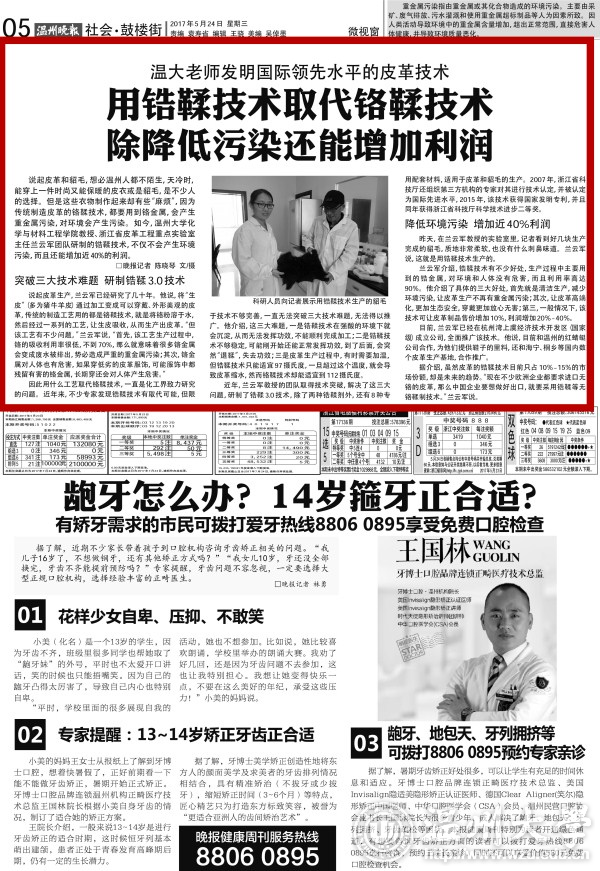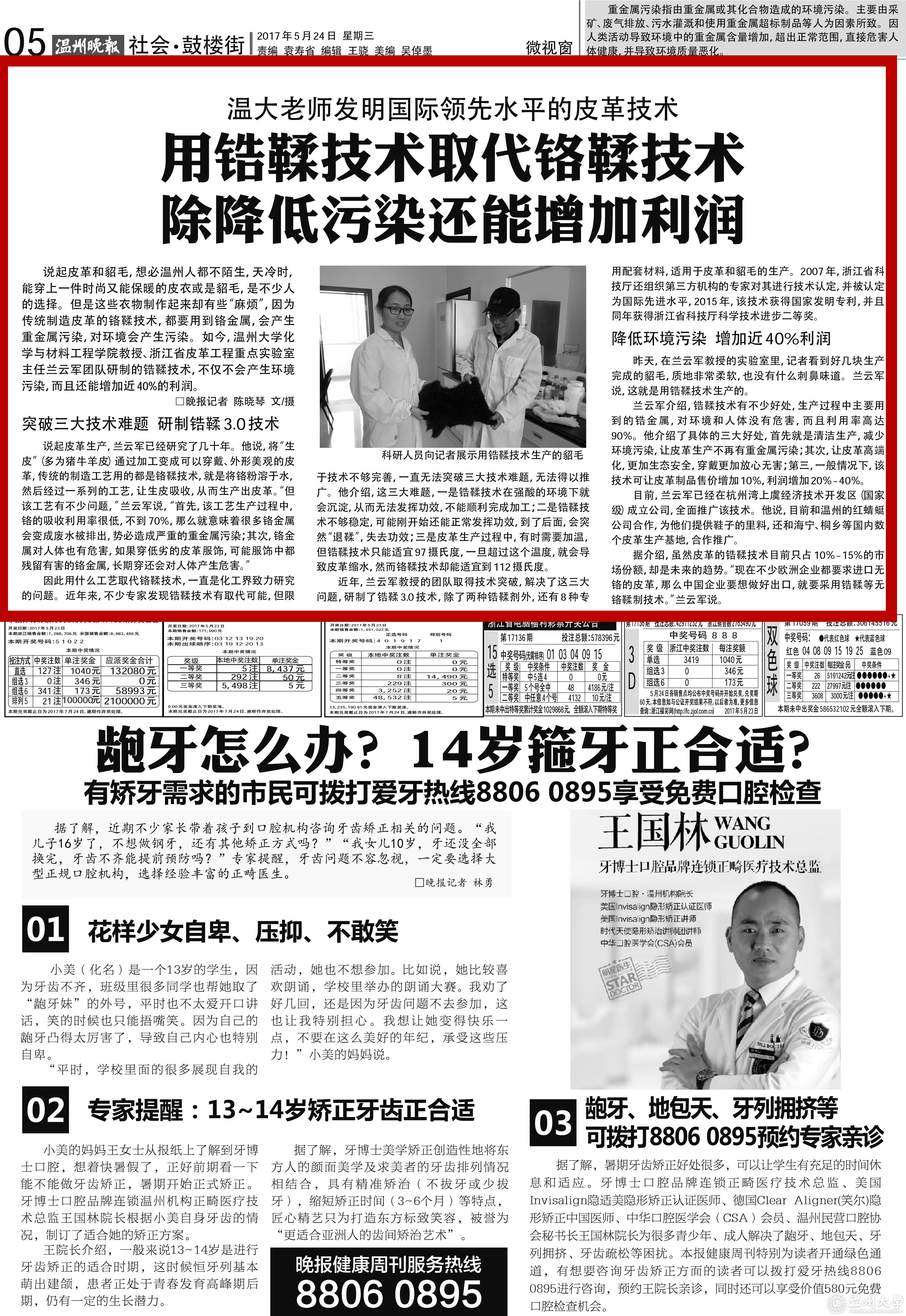 说起皮革和貂毛,想必温州人都不陌生,天冷时,能穿上一件时尚又能保暖的皮衣或是貂毛,是不少人的选择。但是这些衣物制作起来却有些“麻烦”,因为传统制造皮革的铬鞣技术,都要用到铬金属,会产生重金属污染,对环境会产生污染。如今,少妇白洁 化学与材料工程学院教授、浙江省皮革工程重点实验室主任兰云军团队研制的锆鞣技术,不仅不会产生环境污染,而且还能增加近40%的利润。
