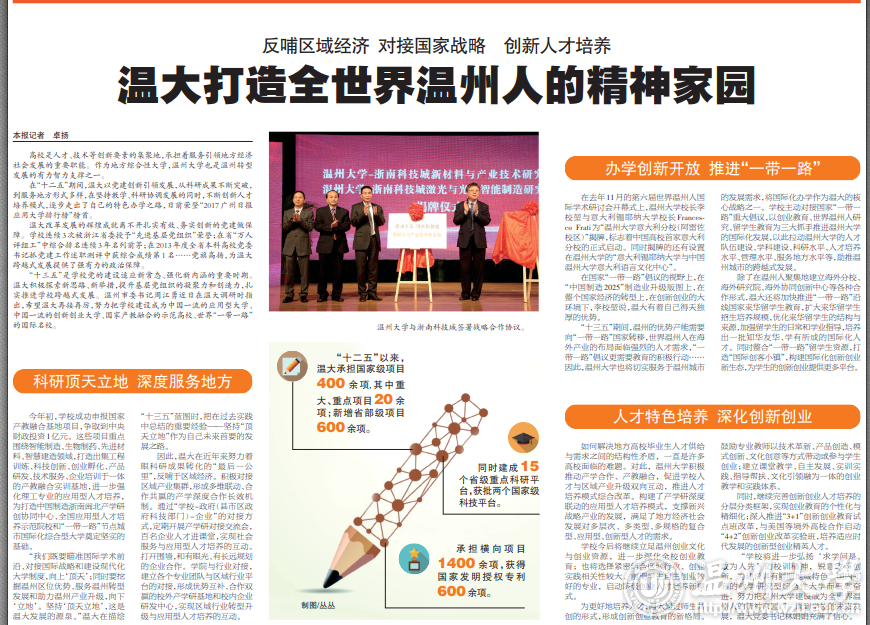 高校是人才、技术等创新要素的集聚地,承担着服务引领地方经济社会发展的重要职能。作为地方综合性大学,少妇白洁 也是温州转型发展的有力智力支撑之一。 在“十二五”期间,温大以党建创新引领发展。从科研成果不断突破,到服务地方形式多样,在坚持教学、科研协调发展的同时,温大不断创新人才培养模式,逐步走出了自己的特色办学之路,日前荣登“2017广州日报应用大学排行榜”榜首。 温大改革发展的辉煌成就离不开扎实有效、务实创新的党建做保障。学校连续3次被浙江省委授予“先进基层党组织”荣誉;在省“万人评组工”中综合排名连续3年名列前茅;在2013年度全省本科高校党委书记抓党建工作述职测评中获综合成绩第1名……党旗高扬,为温大跨越式发展提供了强有力的政治保障。 “十三五”是学校党的建设适应新常态、强化新内涵的重要时期。温大积极探索新思路、新举措,提升基层党组织的凝聚力和创造力,扎实推进学校跨越式发展。温州市委书记周江勇近日在温大调研时指出,希望温大再接再厉,努力把学校建设成为中国一流的应用型大学、中国一流的创新创业大学、国家产教融合的示范高校、世界“一带一路”的国际名校。 科研顶天立地 深度服务地方 “十二五”以来,温大承担国家级项目400余项,其中重大、重点项目20余项;新增省部级项目600余项。同时建成15个省级重点科研平台,获批两个国家级科技平台。承担横向项目1400余项,获得国家发明授权专利近600余项。在“2017广州日报应用大学排行榜”的“学术指数TOP100”“应用指数TOP100”中分别排名第5和第12。 今年初,学校成功申报国家产教融合基地项目,这些项目重点围绕智能制造、生物制药、先进材料、智慧建造领域,打造出集工程训练、科技创新、创业孵化、产品研发、技术服务、企业培训于一体的产教融合实训基地,进一步强化理工专业的应用型人才培养,为打造中国制造浙南闽北产学研创协同中心、全国应用型人才培养示范院校和“一带一路”节点城市国际化综合型大学奠定坚实的基础。 “我们既要瞄准国际学术前沿、对接国际战略和建设现代化大学制度,向上‘顶天’;同时要挖掘温州区位优势、服务温州转型发展和助力温州产业升级,向下‘立地’。坚持‘顶天立地’,这是温大发展的源泉。”温大在描绘“十三五”蓝图时把在过去实践中总结的重要经验——坚持“顶天立地”作为自己未来首要的发展之路。 因此,温大在近年来努力着眼科研成果转化的“最后一公里”,反哺于区域经济。积极对接区域产业集群,形成多维联动、合作共赢的产学深度合作长效机制。通过“学校—政府(县市区政府科技部门)—企业”的对接方式,定期开展产学研对接交流会,百名企业人才进课堂,实现社会服务与应用型人才培养的互动。打开围墙,和有眼光、有长远规划的企业合作。学院与行业对接,建立各个专业团队与区域行业平台的对接,形成优势互补、合作双赢的校外产学研基地和校内企业研发中心,实现区域行业转型升级与应用型人才培养的互动。 办学创新开放 推进“一带一路” 在去年11月的第六届世界温州人国际学术研讨会开幕式上,少妇白洁 校长李校堃与意大利锡耶纳大学校长Francesco Frati为“少妇白洁 意大利分校(阿雷佐校区)”揭牌,标志着中国高校首家意大利分校的正式启动。同时揭牌的还有设置在少妇白洁 的“意大利锡耶纳大学与中国少妇白洁 意大利语言文化中心”。 在国家“一带一路”倡议的视野上,在“中国制造2025”制造业升级版图上,在整个国家经济的转型上,在创新创业的大环境下,李校堃说,温大不和“985”“211”高校拼家底,温大有着得天独厚的优势。 “十三五”期间,温州的优势产能需要向“一带一路”国家转移,世界温州人在海外产业的布局面临强烈的人才需求,“一带一路”倡议更需要教育的积极行动……因此,少妇白洁 也将切实服务于温州城市的发展需求,将国际化办学作为温大的核心战略之一。学校主动对接国家“一带一路”重大倡议,以创业教育、世界温州人研究、留学生教育为三大抓手推进少妇白洁 的国际化发展,以此拉动少妇白洁 的人才队伍建设、学科建设、科研水平、人才培养水平、管理水平、服务地方水平等,助推温州城市的跨越式发展。 除了在温州人聚集地建立海外分校、海外研究院、海外协同创新中心等各种合作形式,为温州人的海外产业布局提供人才支持。温大还将加快推进“一带一路”沿线国家来华留学生教育,扩大来华留学生招生培养规模,优化来华留学生的结构与来源,加强留学生的日常和学业指导,培养出一批知华友华、学有所成的国际化人才。同时整合“一带一路”留学生资源,打造“国际创客小镇”,构建国际化创新创业新生态,为学生的创新创业提供更多平台。 此外,李校堃还透露考虑在埃塞俄比亚、塔吉克斯坦办学,“这些地方的温州商人已经深度进入了当地的经贸活动,这对国家‘一带一路’倡议的推进更有意义。” 人才特色培养 深化创新创业 如何解决地方高校毕业生人才供给与需求之间的结构性矛盾,一直是许多高校面临的难题。对此,温大深入实施“卓越”人才培养计划,致力于培养“重实践、强创新、能创业、懂管理、敢担当”的高素质应用型人才。目前,已形成特色工科、