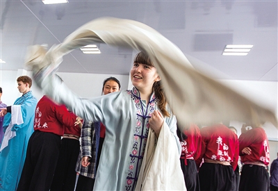 洋学生对瓯剧班学生展示的水袖、翻跟斗、耍铜锤等产生了浓厚的兴趣,并踊跃要求现场学艺,在瓯剧班学员的手把手指导下有模有样地学起了舞刀弄棍。武生行当学员李晗成了现场的明星,他每翻个跟斗、耍一下花枪都会引来洋学生围观,这些兼具技巧、身段的行当表演给他们留下了深刻的印象,场内不时响起热烈的喝彩和掌声。一位高个子的学生表示:“中国戏曲文化太有趣太好看了,但台上一分钟需要台下十年功的努力和付出,令人佩服!”