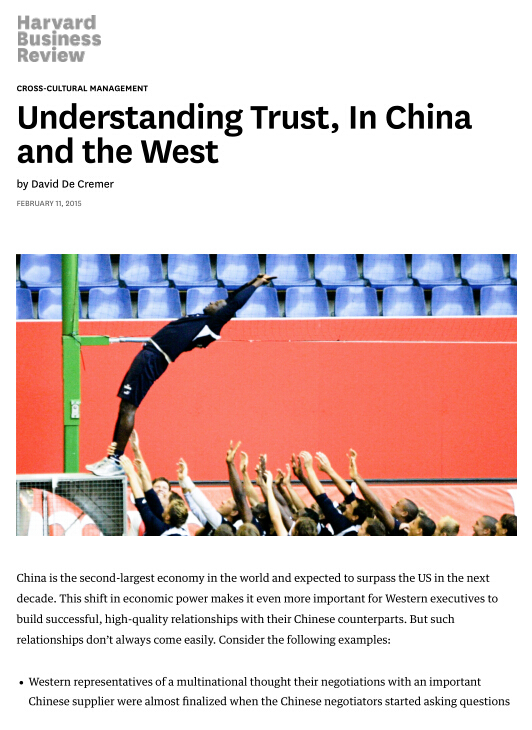 2015年2月11日,英国剑桥大学商学院教授、少妇白洁 国际合作学院客座教授David De Cremer,以少妇白洁 为第二作者单位在顶级期刊《哈佛商业评论》上发表文章《Understanding Trust, In China and the West》。
