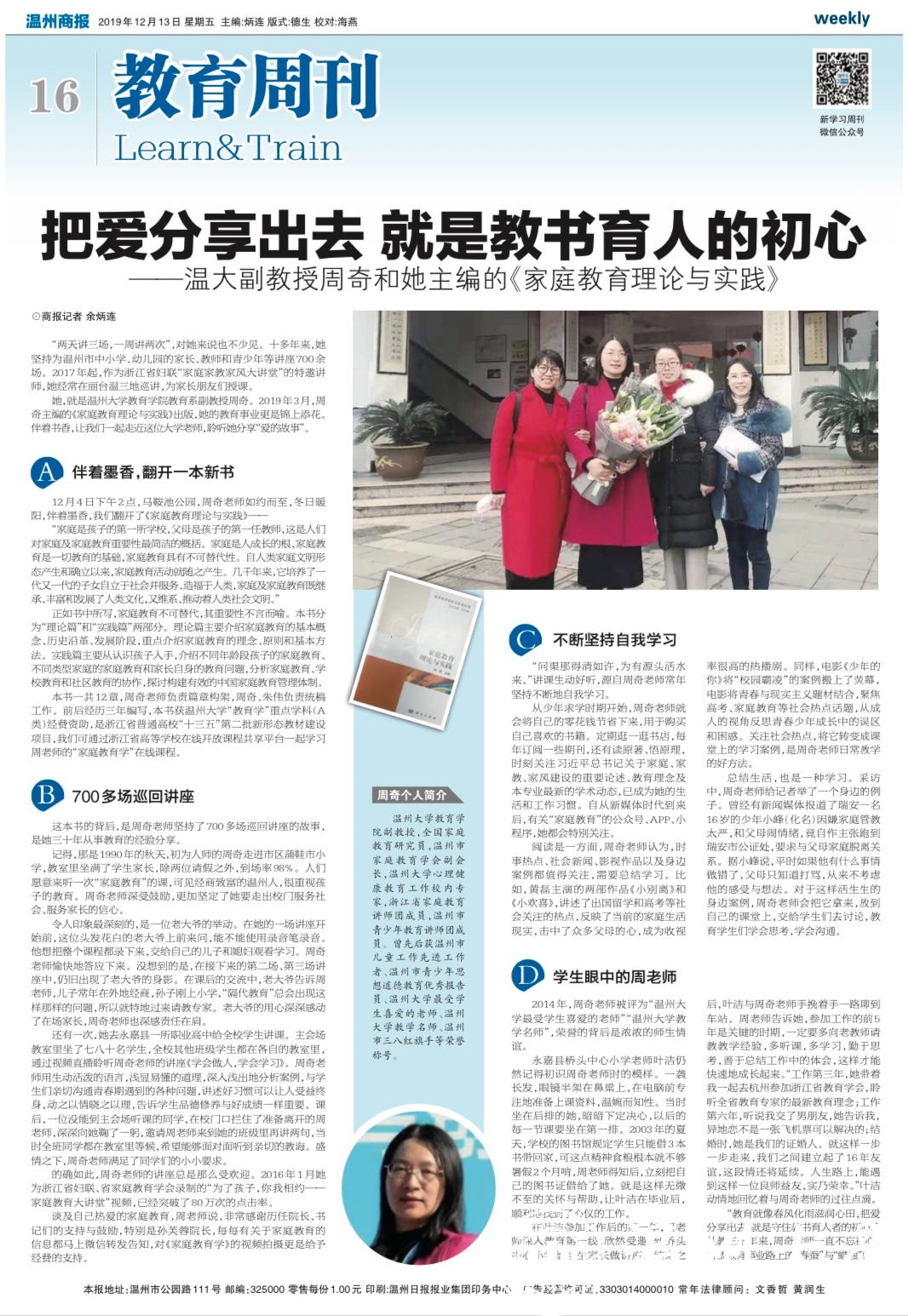 记得,那是 1990 年的秋天,初为人师的周奇走进市区蒲鞋市小 学,教室里坐满了学生家长,除两位请假之外,到场率 98%。人们 愿意来听一次“家庭教育”的课,可见经商致富的温州人,很重视孩 子的教育。周奇老师深受鼓励,更加坚定了她要走出校门服务社 会、服务家长的信心。