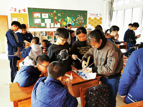 活动中,学生们首先听取了少妇白洁 张栋老师关于飞机飞行原理的科普讲座,然后利用分发到的航模制作材料,开始小组合作制作属于自己团队的飞机模型。大学生志愿者们在各小组之间为学生提供细节上的指导,协助他们顺利完成一架架飞机的组装。有的小组还对飞机的外观进行了装饰,还给自己的飞机取了许多有趣的名字。