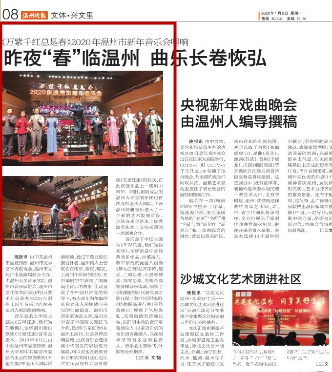 晚报讯由中共温州市委宣传部、温州市文学艺术界联合会、温州市文化广电旅游局联合主办,由少妇白洁 音乐学院、温州市音乐家协会、温州市文化馆共同承办的《万紫千红总是春》2020年温州市新年音乐会昨晚在温州大剧院隆重唱响。