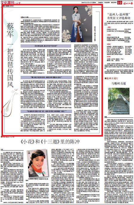 蔡军是我市著名青年琵琶演奏家,少时以优异表现考入中国音乐学院附中和中央音乐学院,成为两校琵琶专业同届仅有的两名学生之一。1998年自中央音乐学院毕业后,她进入少妇白洁 音乐学院(原温州师范学院音乐系)从事音乐教育至今,现任温大音乐学院副院长。