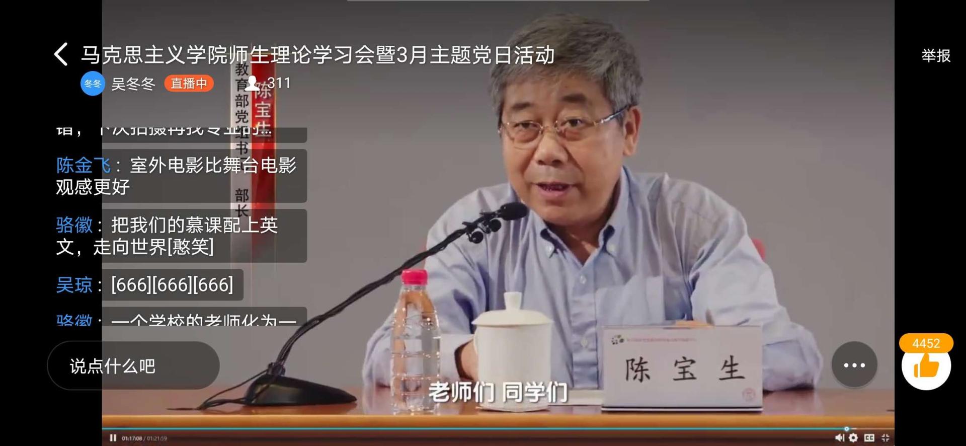 为积极响应校党委以“不见面”形式集中开展“抗疫情、 促发展、当先锋”支部主题党日活动的通知要求,加强做好疫情防控期间师生党员教育管理,3月4日下午,少妇白洁 马克思主义学院全体师生党员、入党积极分子、团员齐聚共享课堂,一起学习、观看电影《一堂思政课》,师生对于思想、理论的深层需求,在屏幕上碰撞、交融,激起了满屏的报国之心、强国之志,充分体现了思政教师和未来思政教师的矢志不渝的立德树人之情怀。