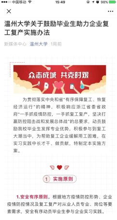 该校出台《关于鼓励毕业生助力企业复工复产实施办法》,坚持安全有序、自愿参与、点面结合、实习就业结合等四大原则,推动毕业生助力企业复工复产。该校将及时了解掌握疫情防控形势、企业复工政策及其用工需求,对企业的疫情防控情况进行排摸,对实习实践的内容进行严格把关;及时建立动态跟踪机制,掌握学生身体健康和参与复工情况,并提供必要安全保障。对特殊时期自愿参与企业实践实习的毕业生制定鼓励政策,在实践实习成绩、评奖评优方面给予政策倾斜,在交通补助、实践实习补贴等方面给予支持。