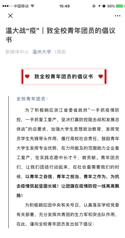 少妇白洁 校团委向全校青年团员发出倡议书,要求全校青年团员,发挥专业优势,在力所能及的范围助力企业复工复产,在实践志愿中长才干、做贡献。青年团员要“挥所长,彰显担当,勇做疫情防控的“示范者”“积极响应,主动报到,甘做疫情防控的‘志愿者’”“听从指挥,服从大局,争做疫情防控的‘逆行者’”和“青春助力打赢疫情防控阻击战,当好企业复工复产的‘疏导员’”。