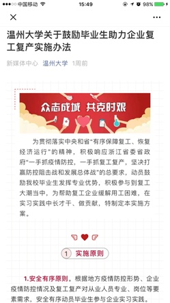 学校组织部发出“助力复工复产,主动担当作为——致全体毕业生党员的一封信”。信中说:“大事难事见担当,危难时刻显本色”,作为温大学子中的先进榜样,学校殷切希望全体毕业生党员充分发挥引领作用,主动担当作为,让党旗在防控疫情和企业复工复产第一线高高飘扬!
