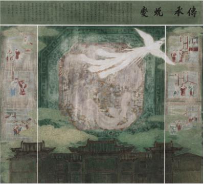 与此同时,接触古戏台等温州本土文化后,谢子静对于作品的创作理念也有了些许转变。获2019年浙江省第十四届美展优秀奖《传承·蜕变》是谢子静近期的创作作品,画面表现的是温州古戏台的一组组戏曲彩绘图饰,辅以吉祥纹饰。彩绘人物动态夸张、生动,线条运用娴熟、流畅,色彩斑驳、厚重,以传统的工笔重彩技法记载了温州戏曲文化与民俗文化。作者认为其作品的得意之处在于画面以一只飞鸟置于前景,将不同时期舞台的图饰作为背景,达到穿越时空的联想。