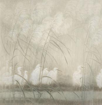在入选浙江省第十三届美展的作品《蒹葭苍苍》中,谢子静以平日里采风、写生途中所见的芦苇与栖息的白鹭为画材,以宋明院体花鸟画之雍容谨严的画风,参以文人画逸笔的幽远意境与简澹设色,营造画者心中氤氲已久的古典幽梦,旨在表现自然界动人和谐的一幕,寄寓着摆脱尘俗,融入超逸的自然景界,抒发了一种美好的心境。最终,反映在画上,这花鸟,已不是世俗的花鸟,它们构筑出画家心灵的家园。