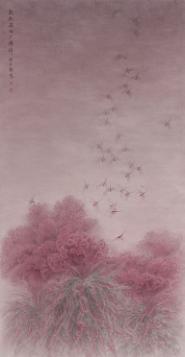 “翘首轻摇舞绛霞,紫衣抖擞问青纱。园林因我增姿色,苑圃红添更丽华。晓畅轻风皆瑞奇,晴柔景物尤祥嘉。蜻蜓轻展纤纤翼,款款飞回夕阳斜。”这是谢子静入选浙江省第十二届美展的作品《融风庭院总飞红》上的一首诗。在作品中,夕阳余晖下,一组组火红的鸡冠花争相怒放,一群群红色的蜻蜓在花间穿梭。“让我记忆非常深刻,野生的鸡冠花植株高大,姿态寥廓,我感受到了一抹生机,和茁壮生长的野趣。”谢子静说,情急之下她便命笔记写,后来托朋友帮其要来了一株鸡冠花,了解它的细节,再融入她的感情。最终成品后,谢子静的鸡冠花依然红艳,剔透得像是滚过胭脂的一滴水。