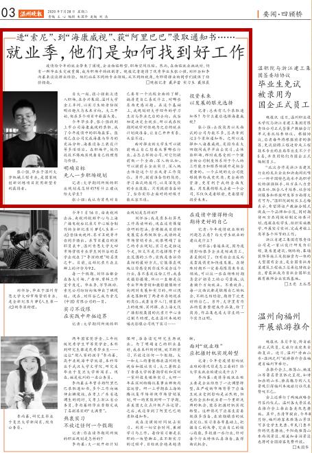 疫情给今年的就业带来了困境,企业面临转型、职场空间压缩。然而,在面临就业挑战时,仍有一群毕业生突破重围,成为职场中的收割者。晚报记者邀请了优秀毕业生张小强、刘怀谷和李雨蓁来谈谈择业经验。他们站在不同的专业领域、从不同的视角,为即将择业的同学们提供了经验指南。