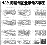 张一力在《温州商报》上刊发的第一篇文章《13%的温州企业家是大学生》。(2002年9月24日B02版)