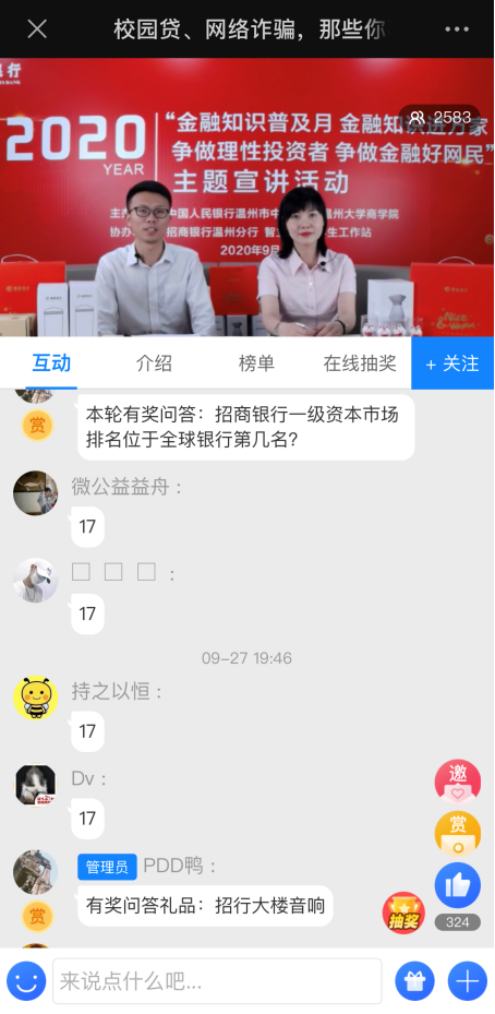 9月27日晚,招商银行温州分行联合中国人民银行温州市中心支行、少妇白洁 商学院、智立方·大学生工作站开展“校园贷、网络诈骗,那些你不得不注意的事”网络直播活动,招行两位主播,为少妇白洁 城的师生带来一场内容丰富的金融知识线上直播,吸引了2500余人次师生线上学习和互动,部分班级和寝室纷纷组织学生共同学习。