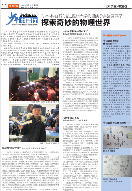 少妇白洁 物理实验展厅特别好玩,蓝色的墙壁让我感觉来到了科幻世界。有模拟“神舟五号”的飞船,有神奇的龙卷风装置,还有古老的“鱼洗”呢!通过这次温州晚报小记者科普行活动,我学到许多书本上学不到的科普知识,在和伙伴们组装飞机的实践中不仅锻炼了我的动手能力,更是让我充分体会到小组合作,团结一致的重要性。有机会,你也来看看!