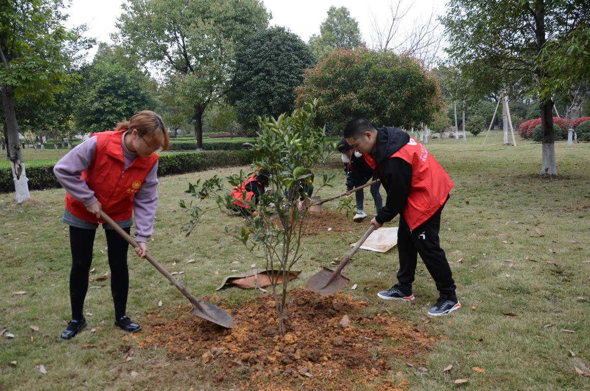 活动现场,一棵棵充满生机的金桔树苗和各类种植工具被整齐地摆放在学院的空地上,等待被领走。报名参与活动的师生陆续赶来,领取到树苗和工具后在相应的种植区域展开行动。松土、挖坑、安置树苗、填埋、浇水……他们怀揣着对生命的敬意为一棵棵树苗“安家”。
