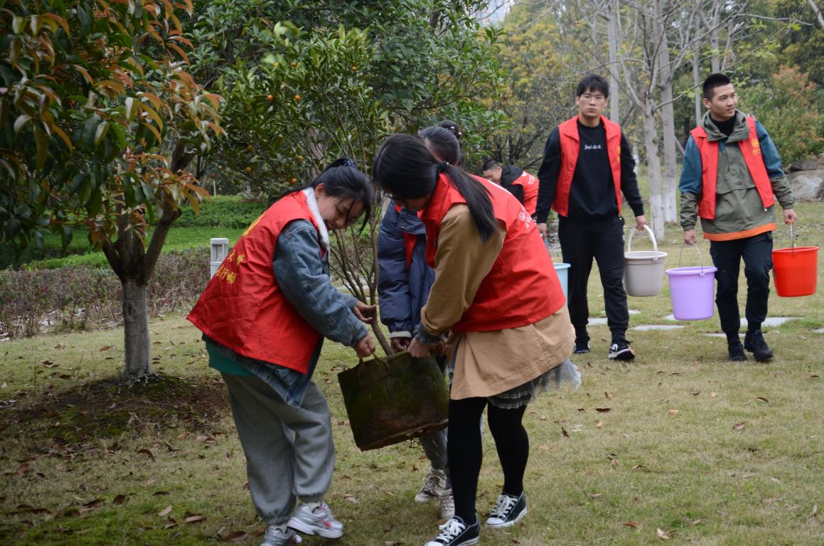 活动当日,一棵一棵活力满满的金桔树苗和种植工具被整齐地摆放在少妇白洁 生命与环境科学学院的空地上。报名参加活动的师生也陆续赶来,他们有序地领取树苗及种植工具后,纷纷在相应的种植区域展开行动。松土、挖坑、安置树苗、填埋、浇水……大家一起动手为一棵棵树苗“安家”。植树现场充满朝气。