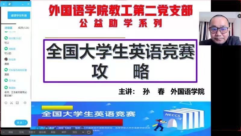 为进一步强化学生语言技能,促进学生积极参与全国大学生英语竞赛并取得佳绩,外国语学院教工第二党支部积极推动专题系列公益讲座为学生答疑解惑。