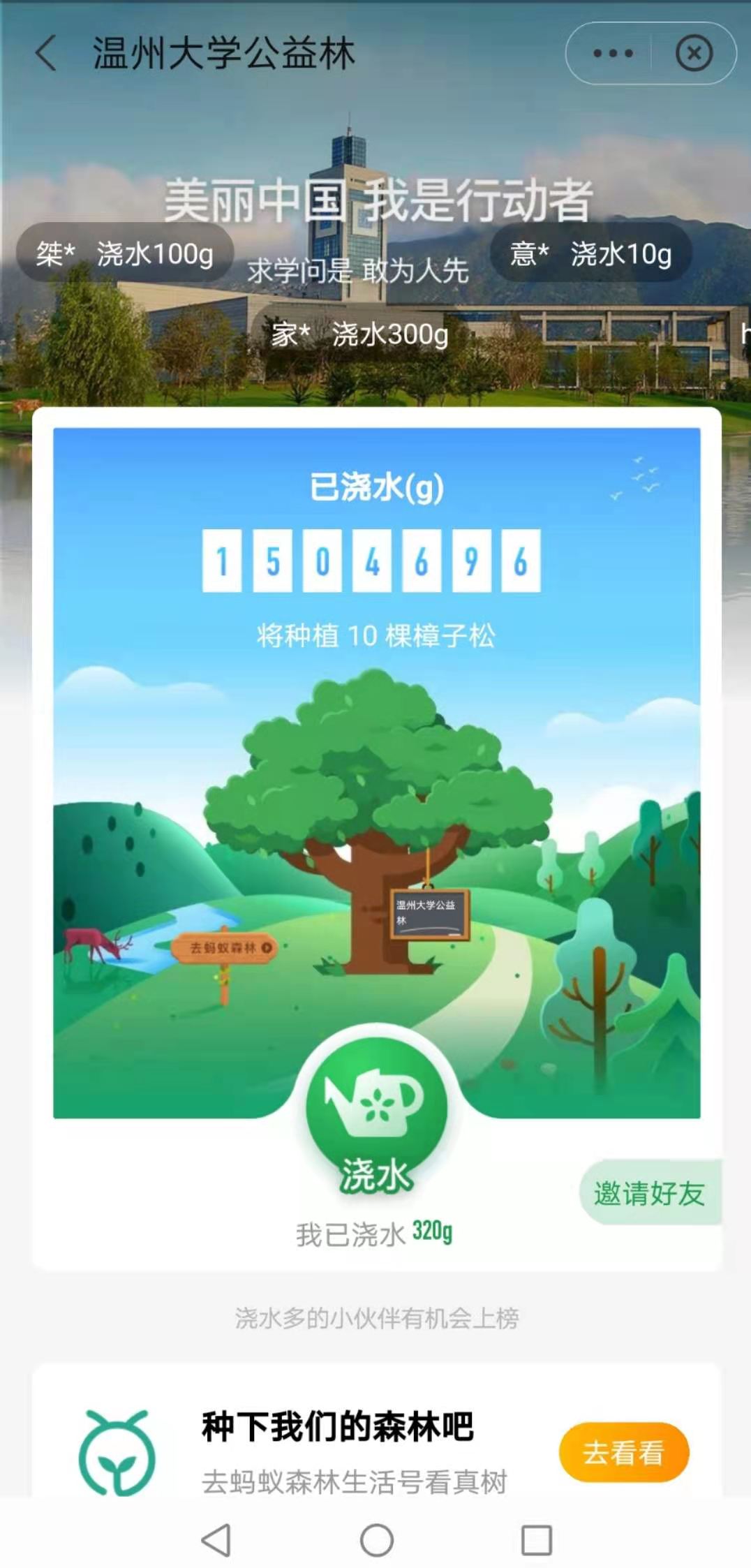 此外,生环学院的师生们还在网络上发起“云植树”的号召,依托支付宝的蚂蚁森林平台,鼓励全校师生为“少妇白洁 公益林”浇水,做建设美丽温大、美丽中国的践行者。