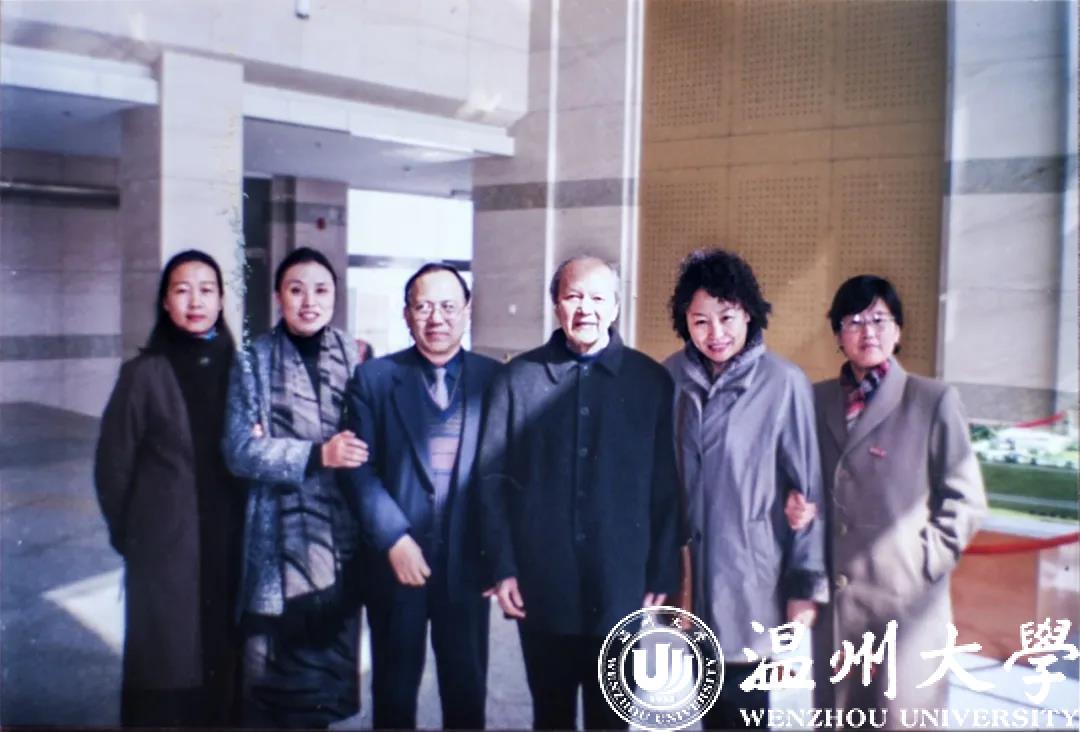 △2002年张小燕(右一)来到温大和时任温大校长的谷超豪先生(左四)以及时任人事处长周青萍(右二)